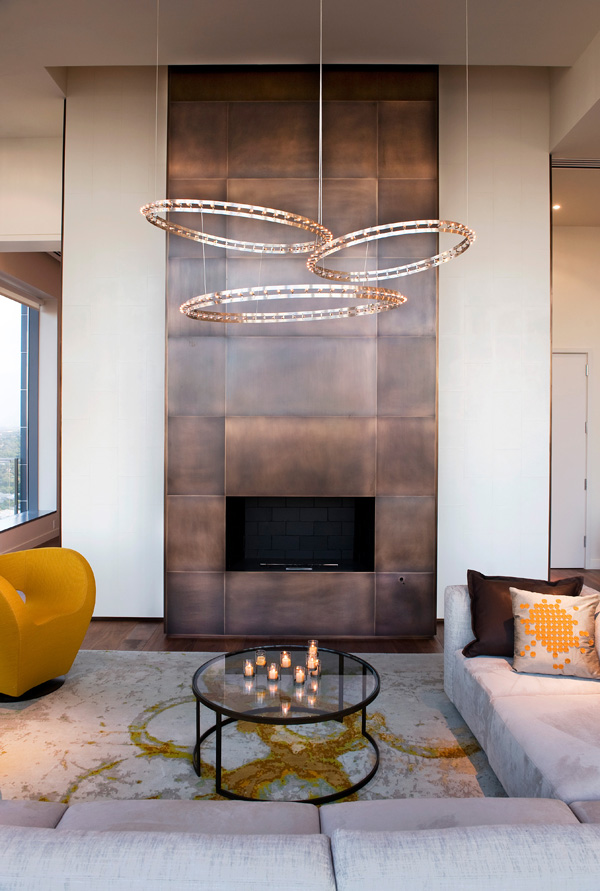 White leather walls, brushed bronze fireplace and walnut floors.