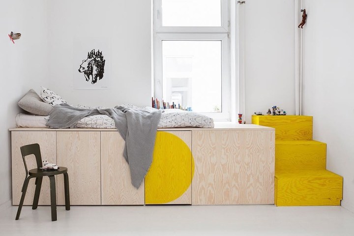 Bunk beds are always a fun idea. It’s a simple design that doesn’t take much space and we love how light it looks. Bunk beds can sometimes look bulky and heavy but here the use of plywood and having just a mattress on the floor as the second bed, makes this one blend in beautifully.