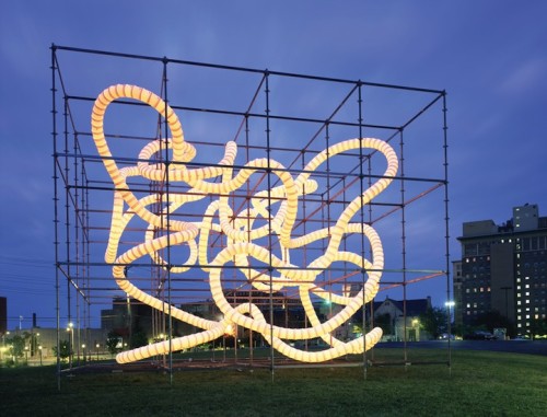They are little huts of woven willow branches creating tunnels and arches, in and out of doorways. The art piece is called Double Take and here is a YouTube video about its installation. If you happen to be in the SF Bay Area Peninsula area, the Palo Alto Art Center is worth a visit. Patrick Dougherty’s sculptures have been there for a few years, and the sculpture will remain until the willow branches naturally decay.